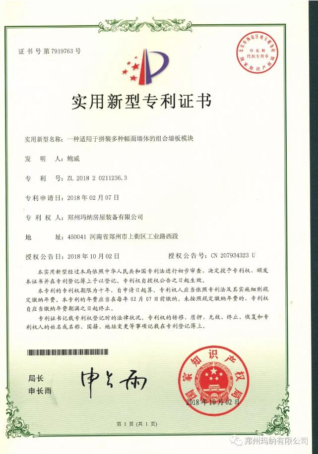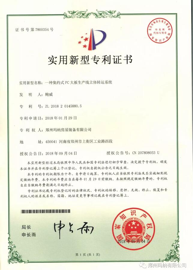 近兩個(gè)月,瑪納公司喜獲兩項(xiàng)新型實(shí)用證書,分別是“一種集約式PC大板生產(chǎn)線立體轉(zhuǎn)運(yùn)系統(tǒng)”和“一種適用于拼裝多種幅面墻體的組合墻板模塊”。號(hào)分別為:ZL 2018 2 0145880.5和ZL 2018 2 0211236.3。