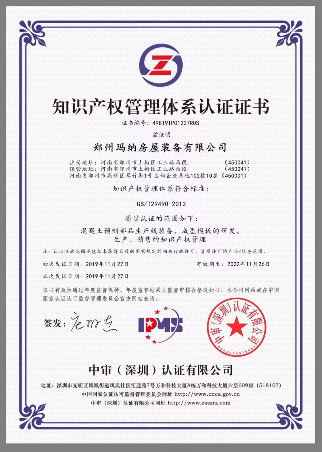 2019年11月27日,鄭州瑪納房屋裝備有限公司獲得第三方認(rèn)證機(jī)構(gòu)頒發(fā)的《知識(shí)產(chǎn)權(quán)管理體系認(rèn)證證書》,