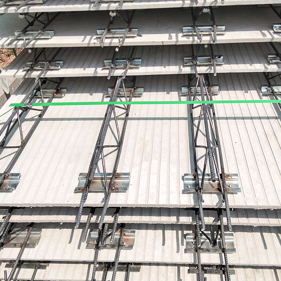 鋼筋桁架薄型高性能混凝土疊合樓板是由鋼筋桁架、1.5-2.5cm預(yù)制混凝土底層組成的疊合樓板。施工階段由鋼筋桁架和底部混凝土形成整體支撐體系,承受濕混凝土、施工荷載,無(wú)需其他模板支撐,混凝土澆筑完成后鋼筋桁架作為樓板使用階段的受力鋼筋,承受使用階段荷載,底部混凝土界面后期可以直接裝飾裝修。