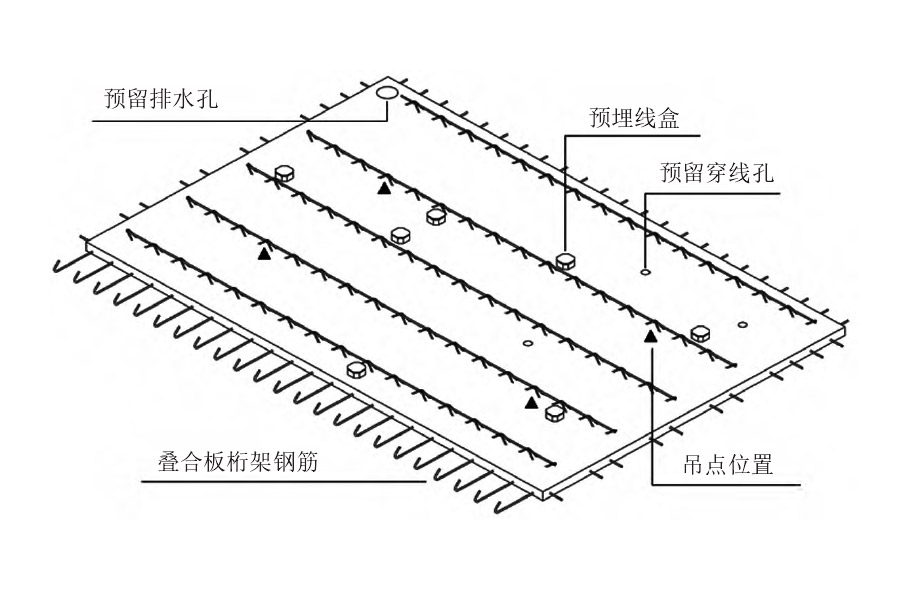 一般由設(shè)計(jì)院根據(jù)建設(shè)單位的意圖,按照現(xiàn)澆的標(biāo)準(zhǔn)和要求進(jìn)行結(jié)構(gòu)設(shè)計(jì)。預(yù)制構(gòu)件廠在施工圖的基礎(chǔ)上進(jìn)行拆分,將整體建筑拆分成單一構(gòu)件,在充分協(xié)調(diào)各個(gè)專業(yè)之后,確保專業(yè)之間無(wú)碰撞,即完成圖紙的深化設(shè)計(jì),深化設(shè)計(jì)圖紙包括預(yù)留預(yù)埋點(diǎn)位、脫模、吊裝點(diǎn)位及結(jié)構(gòu)配筋詳圖的做法和要求,深化設(shè)計(jì)圖紙可以滿足構(gòu)件加工生產(chǎn)和現(xiàn)場(chǎng)安裝的需求,本研究以疊合板深化設(shè)計(jì)詳圖為例,深化設(shè)計(jì)如下圖所示。