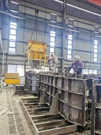 混凝土經(jīng)攪拌罐生產(chǎn)完畢后,經(jīng)由吊斗運輸?shù)綕仓䥇^(qū)澆筑。將混凝土澆筑到模具后,進行振搗。