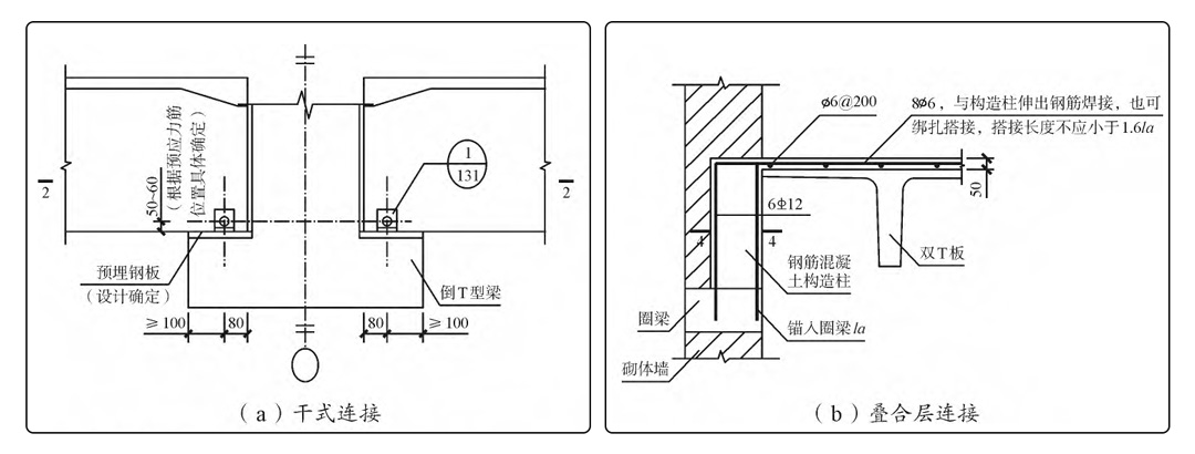 目前,有國家圖集18G432-1《預(yù)應(yīng)力混凝土雙T板》作為工程應(yīng)用依據(jù)。其連接構(gòu)造分為干式連接、疊合層連接和組合連接3種,其中干式連接和疊合層連接如上圖所示。干式連接包括焊接和螺栓連接,一般用于低抗震設(shè)防烈度區(qū);疊合層連接由疊合層抵抗樓蓋水平荷載,連接件只是方便安裝;組合連接中后澆層和連接件共同提高樓板作用;在中、高設(shè)防烈度區(qū)建議采用疊合層連接或組合連接。