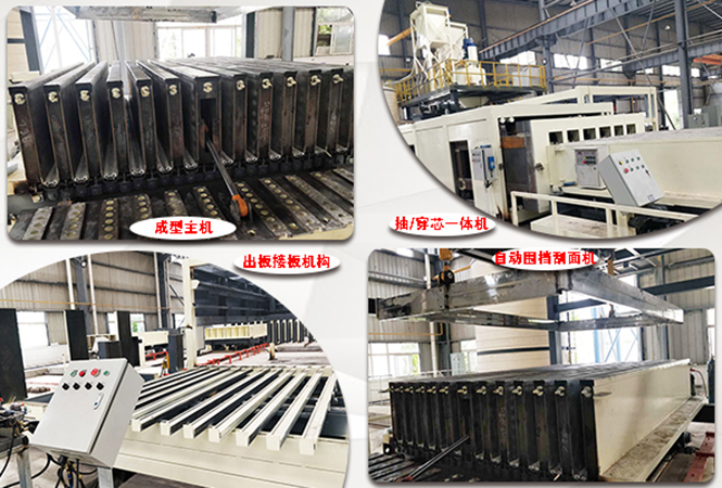 M30石膏墻板生產線設備組成:成型主機—可靈活配置,數量決定產量;抽/穿芯一體機—一次性液壓自動穿管,自動液壓抽管;出板接板機構—出板、接板,方便打包運輸;上成型機—液壓自動下壓,震動,上面成型;自動圍擋刮面機—布料時,自動放置圍擋,避免濺料,布料后,自動刮平漿料。