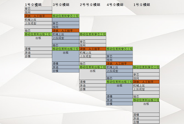 2. 穿芯工位:成組立模機對位定位,操作抽芯機完成穿芯動作,過程中人工對芯管做噴油處理。注意芯管是否準確穿入,如芯管出現(xiàn)錯位過多,應(yīng)立即停止;噴油盡可能均勻噴涂,采用油性脫模劑。